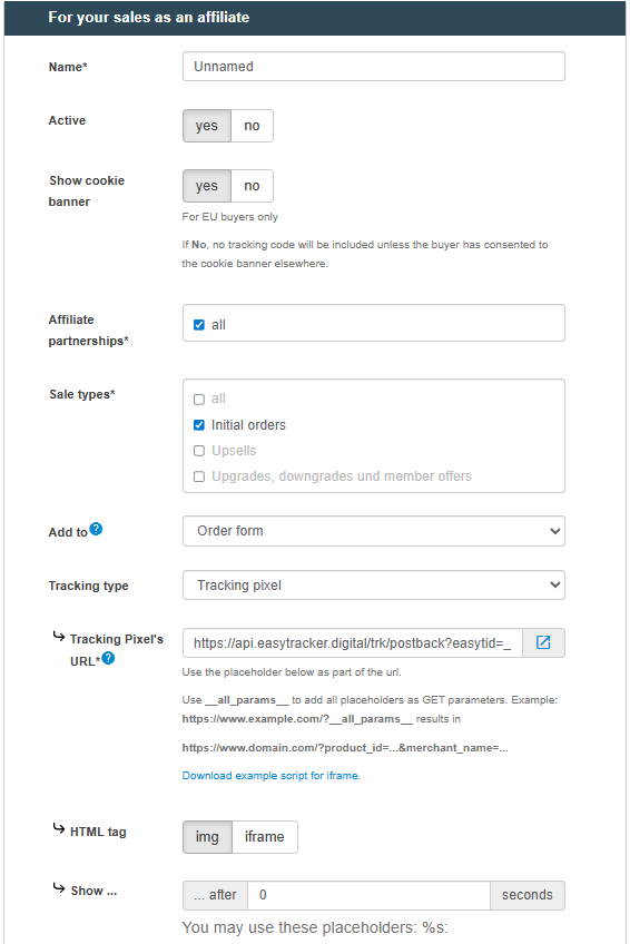 - Deixe as opções igual a imagem abaixo, preencha o Tracking Pixel's URL (substitua pelo seu domínio utilizado no EasyTracker): https://api.easytracker.digital/trk/postback?easytid=__cid__&action=InitiateCheckout