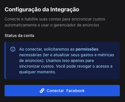 - Na tela de integração, navegue até a seção de Configuração de Integração e clique em Conectar Facebook