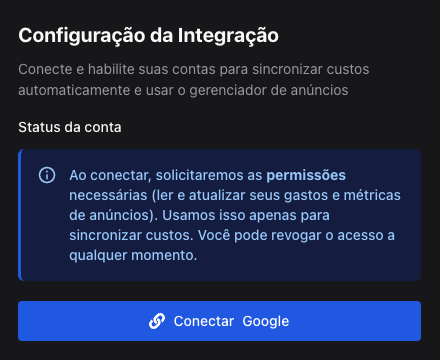- Na tela de integração, navegue até a seção de Configuração de Integração e clique em Conectar Google