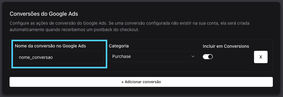 O nome atribuído no campo Nome da conversão no Google Ads nas configurações, tem que ser exatamente o mesmo nome que você colocou no campo Tipo de Conversão quando configurou o checkout do EasyTracker e no próprio Google Ads