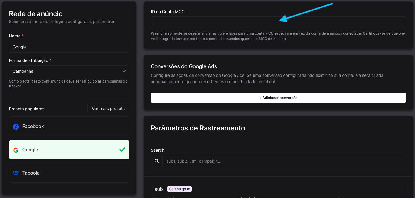 - No campo ID da conta MCC, preencha somente se desejar enviar as conversões para uma conta MCC específica em vez da conta de anúncios conectada. Certifique-se de que o e-mail integrado tem acesso tanto à conta de anúncios quanto ao MCC de destino.
